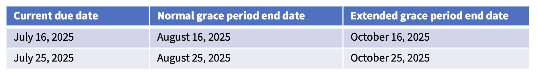 a. Policies with due dates from July 16, 2025 to July 25, 2025. Due dates outside this period will retain the normal grace period.
