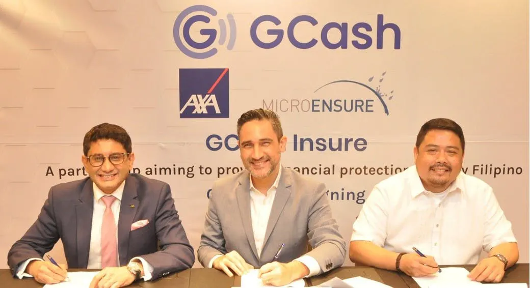 AXA Philippines, one of the country's leading insurance providers, is the underwriter of GCash Insure, the new comprehensive yet affordable insurance product with life and personal accident insurance coverage of up to P200,000 and daily hospital income insurance up to P10,000. Available to GCash users, this new insurance product is powered by technology from MicroEnsure. Photo shows (L-R) AXA Philippines president and CEO Rahul Hora, GCash chief data officer Jean-Francois Darre, and MicroEnsure country manager Roger De Pedro.