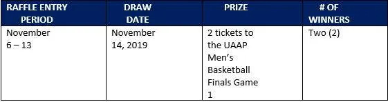 i. Two (2) winner will be drawn on November 14, 2019[MV1] to win 2 tickets each to the UAAP Men’s Basketball Finals Game 1